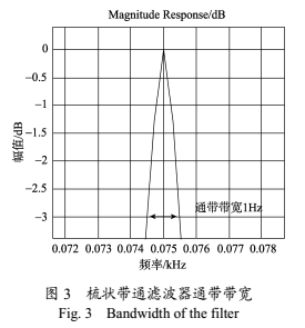 由帶通濾波器的通頻帶定義可知,存在兩個截至頻率fH和fL,當信號頻率上升到fH或者下降到fL時,使得輸出信號從*大值衰減3dB。圖3所示為通帶帶寬為1Hz的梳狀帶通濾波器局部放大圖。