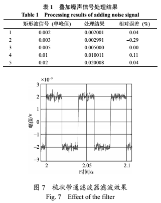 *先采用MATLAB產(chǎn)生上述疊加噪聲的信號,信號的頻率為25Hz,矩形波單峰值范圍為0.002~0.02,疊加上噪聲干擾后的信噪比范圍在-10.9dB~9.1dB。對產(chǎn)生的信號進行梳狀帶通濾波,然后進行幅值解調(diào),取進入穩(wěn)態(tài)后的計算結(jié)果與準確值進行比較,得到的結(jié)果如表1所示,此時濾波器的帶寬b=1Hz。對圖6中的含噪聲信號的處理效果如圖7所示。