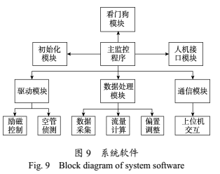 系統(tǒng)軟件設計采用模塊化設計方案,由主監(jiān)控程序程序統(tǒng)一調(diào)用。軟件總體框圖如圖9所示。系統(tǒng)軟件包含的主要功能模塊有:初始化模塊、驅(qū)動模塊、數(shù)據(jù)處理模塊、通信模塊、看門狗模塊和人機接口模塊等。