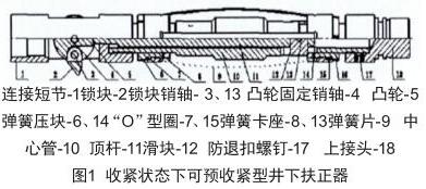 可預收緊型井下扶正器分別連接在電磁流量計的上端與下端,構成上下扶正器,下井前用手或?qū)S檬站o工具,橫向上壓縮固定在彈簧卡座總成上4組彈簧片,在外力作用下簧片徑向收縮,在收縮過程中帶動彈簧卡座徑向位移,撥動滑塊,頂桿向上徑向位移,同時轉(zhuǎn)動凸輪,當凸輪邊緣上的球面凹坑與頂桿成水平線時松開頂桿,頂桿下端圓球面與凸輪上的球面凹坑偶合,松開4組彈簧片,此時彈簧片處于收緊狀態(tài),將儀器裝入防噴管內(nèi),打開測試閘門儀器即可下井,如圖1所示。