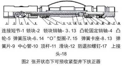 下井的儀器帶動測井鋼絲下行 [2] ,通過井下偏心配水器時,凸輪上的鎖塊克服鎖塊扭簧的扭力作用向上翻轉(zhuǎn),儀器可以順利通過偏心配水器,當下到井筒內(nèi)任何一級偏心工作筒下方時,地面絞車上提儀器,儀器上行經(jīng)過偏心配水器,鎖塊帶動凸輪順時針旋轉(zhuǎn),頂桿球面與凸輪球面凹坑偶合脫開,頂桿上的滑塊在彈簧片彈力作用下向下位移帶動頂桿進入到凸輪凹腔內(nèi),同時扶正器上4個彈簧片在彈力作用下張開貼附在油管內(nèi)壁上(見圖2)保證了儀器在油管內(nèi)居中,然后按照測試方案即可分層流量測試。