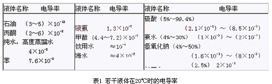 表1 若干液體在20℃時(shí)的電導(dǎo)率