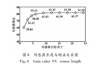 采用一臺日徑為6英寸、標(biāo)準(zhǔn)線圈的傳感器,改變傳感器長度,依次進(jìn)行試驗(yàn)室標(biāo)定試驗(yàn)。傳感器長度與增益的關(guān)系圖如圖4所示。當(dāng)傳感器長度為9. 1英寸時(shí),其增益為61. 03;但當(dāng)其長度繼續(xù)增加時(shí),增益變化較小;當(dāng)其長度6. 1英寸減小到0時(shí),增益從59. 33開始下降。也就是說,當(dāng)傳感器長度為6. 1-9. 1英寸時(shí),既有效利用了線圈產(chǎn)生的磁場,又可使傳感器長度較短。