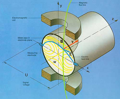 據(jù)法拉*電磁感應(yīng)定律,測(cè)量管道內(nèi)的流動(dòng)的導(dǎo)電液體(等效于許多連續(xù)的導(dǎo)電薄圓盤)做垂直于磁場(chǎng)的運(yùn)動(dòng),產(chǎn)生感應(yīng)電動(dòng)勢(shì),電勢(shì)大小與流量相關(guān)。
