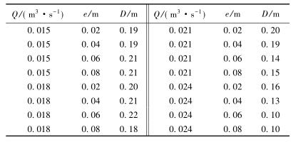 表3中,當(dāng)來流流量較小時(shí)(Q=0.015m3/s),回流區(qū)的長度D隨著浮體結(jié)構(gòu)位置的增大逐漸增大;當(dāng)來流流量較大時(shí)(Q=0.024m3/s),回流區(qū)的長度卻隨著浮體結(jié)構(gòu)位置的增大呈現(xiàn)減小的趨勢。試驗(yàn)過程中,當(dāng)浮體結(jié)構(gòu)位置較高且來流較小時(shí),浮體結(jié)構(gòu)上下部區(qū)域的主流流速較小,回流區(qū)范圍較大;浮體結(jié)構(gòu)位置不變時(shí),來流流量增大,回流區(qū)長度減小。來流增加,下泄水流流速較大,并迅速將回流區(qū)內(nèi)的水流帶入下游區(qū)域,因此回流區(qū)長度反而呈現(xiàn)減小趨勢。
