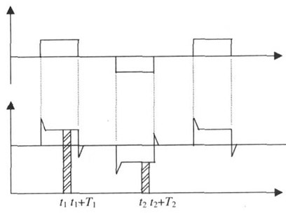 果汁流量計(jì)一般都采用工頻交流電源供電, 其電源電壓的幅值和頻率的變化都會(huì)給果汁流量計(jì)帶來(lái)電源性干擾噪聲。對(duì)電源電壓的幅值變化, 因采用多級(jí)集成穩(wěn)壓, 一般而言電源電壓的幅值變化對(duì)電磁流量的測(cè)量精度影響不大。當(dāng)電源電壓的頻率波動(dòng)時(shí), 雖然其波動(dòng)范圍有限, 但對(duì)果汁流量計(jì)測(cè)量精度影響較大。為了解決工頻干擾問(wèn)題, 實(shí)現(xiàn)對(duì)流體流速感應(yīng)電勢(shì)eab信號(hào)的準(zhǔn)確測(cè)量, 需利用以下基本關(guān)系:①勵(lì)磁周期為工頻周期的整數(shù)倍, 即勵(lì)磁頻率為50/nHz(n為偶數(shù));②正負(fù)勵(lì)磁下的同相位采樣。圖2是對(duì)應(yīng)低頻矩形波勵(lì)磁形式下的典型電勢(shì)信號(hào)形式, 按上述關(guān)系在一個(gè)勵(lì)磁周期下, 若假設(shè)t1 和t2 點(diǎn)為工頻干擾的等效干擾點(diǎn), 且采樣寬度T=T1 =T2 , 則eab的基本算式為: