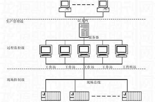 針對(duì)鎢礦選廠生產(chǎn)的實(shí)際需求,這里應(yīng)用相應(yīng)的自動(dòng)化技術(shù),對(duì)自動(dòng)化監(jiān)控系統(tǒng)進(jìn)行了設(shè)計(jì)。在系統(tǒng)設(shè)計(jì)中,遵循“方案合理、技術(shù)先進(jìn)、運(yùn)行可靠、操作方便”的原則,系統(tǒng)整體采用集散控制系統(tǒng),基于現(xiàn)場總線通訊,其整體網(wǎng)絡(luò)構(gòu)架如下: