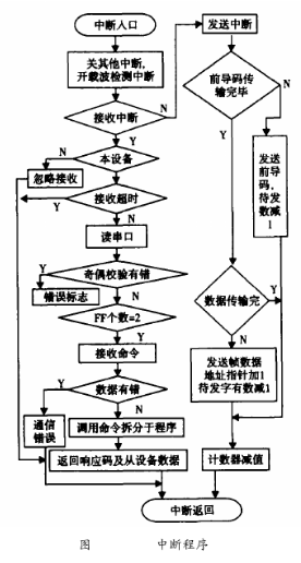 在HART通信中,玻璃水流量計(jì)作為從設(shè)備進(jìn)行通訊,所以這里的軟件設(shè)計(jì)只是針對(duì)于從設(shè)備。HART通信采用水平和垂直校驗(yàn)的方法。當(dāng)檢測(cè)到接收數(shù)據(jù)有差錯(cuò)時(shí),則等到主設(shè)備命令幀發(fā)完后,通知主設(shè)備數(shù)據(jù)接收有誤。主設(shè)備則重新發(fā)命令幀,從而保證通信的準(zhǔn)確可靠。HART中斷子程序流程圖如圖6所示。由于HART通信為主從方式,HART幀中每個(gè)字節(jié)在物理層傳輸需要9ms左右,為了保證通訊的實(shí)時(shí)性,通訊程序采用串行口終端接收/發(fā)送。該中斷所要完成通信中的主要任務(wù),即接收和發(fā)送幀,幀的拆分和打包。