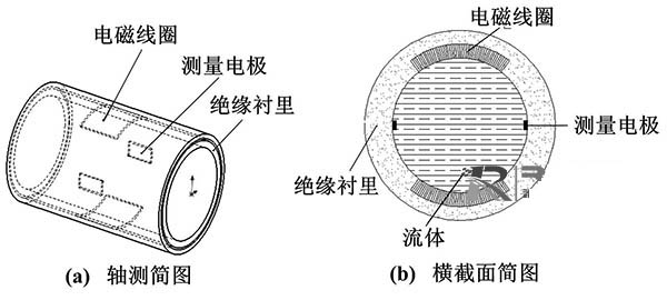 氯化鐵流量計是利用電*與流體構成一個回路來測量回路中產(chǎn)生的電參數(shù)。傳統(tǒng)氯化鐵流量計測量原理如圖1所示。電磁線圈在直徑為d、橫截面積為A的管道中產(chǎn)生一個磁場強度為B的磁場。當有流體經(jīng)過時會切割磁感線而產(chǎn)生感應電動勢U,測量電*接收電動勢信號。由公式Q=(1/k)*(UA/Bd)可計算其流量。式中:Q為流量;k為修正系數(shù)。