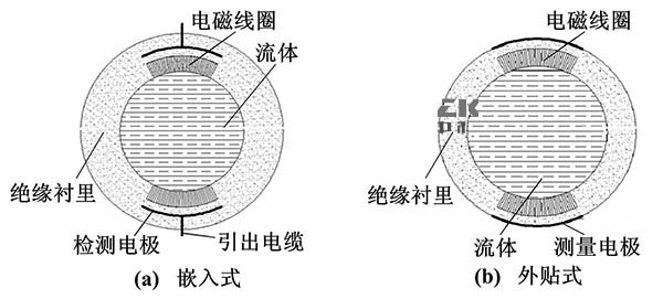 電容式氯化鐵流量計從根本上解決了電*表面附著、腐蝕、摩擦等問題,其電*與被測流體間有絕緣襯里隔離,或者直接采用絕緣測量管。電*置于測量管外面或鑲嵌于測量管內(nèi)部。嵌人式氯化鐵流量計和外貼式氯化鐵流量計的結構如圖2所示。