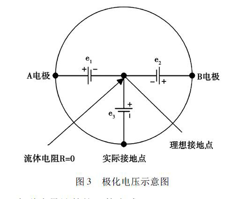 在被測液體與電*和接液部件接觸過程中,電解質(zhì)中的正負離子會分別作定向運動,這會使被測液體在電*和接液部件之間形成電位差,通常將這種現(xiàn)象稱為*化現(xiàn)象。如圖3 所示,理論上來說,兩電*A 和B 對接液部件的電位e1、e2大小相等、方向相反,此時兩電*的電位差等于零。但是,若兩電*的材質(zhì)或表面狀態(tài)存在差異,此時A、B 電*之間的電位差就不為零,這就形成了*化電壓,*化電壓與共模狀態(tài)的電壓e3一起疊加在流量信號中,被輸入轉(zhuǎn)換器的差動放大器。當*化電壓過大,則會對差動放大器的輸入端造成較大影響,導致信號無法放大或流量信號的輸出波動過大,從而降低了丙酸流量計的測量精度。