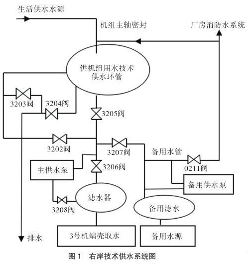 大化電廠技術(shù)供水包括右岸和左岸供水,本文以右岸 3 號(hào)機(jī)技術(shù)供水系統(tǒng)增設(shè)帶現(xiàn)場(chǎng)顯示二次供水流量計(jì)技術(shù)改造方案為例進(jìn)行分析說(shuō)明。右岸技術(shù)供水系統(tǒng)(見圖 1)由各機(jī)組單元蝸殼取水主水源、濾水器、主供水泵、正反向切換閥(3202 閥與 3204 閥開為反向取水,3203 閥與 3205閥開為正向取水,運(yùn)行時(shí)只開其中一種)、備用水源、備用濾水器、備用供水泵和備用總水管構(gòu)成一個(gè)整體,并通過(guò) 0211 閥與廠房消防水系統(tǒng)相連接,可通過(guò)主水源自流供水、主水源水泵增壓供水、備用水源自流供水、備用水源水泵增壓供水等不同供水方式向機(jī)組推力軸承冷卻器和發(fā)導(dǎo)軸承冷卻器、水導(dǎo)軸承冷卻器、發(fā)電機(jī)空氣冷卻器提供冷卻水源。機(jī)組技術(shù)供水正常運(yùn)行采用單元蝸殼取水的供水方式運(yùn)行,以備用水源供水為輔。機(jī)組主軸密封用水分別取自生活供水水源和技術(shù)供水備用總管水源,向機(jī)組大軸提供可調(diào)水壓端面密封水源。在現(xiàn)場(chǎng)配置一個(gè)技術(shù)供水現(xiàn)地單元柜,實(shí)現(xiàn)對(duì)機(jī)組技術(shù)供水系統(tǒng)設(shè)備自動(dòng)控制、故障保護(hù)及報(bào)警。柜內(nèi)配置可編程 PLC 控制系統(tǒng),電控柜對(duì)主供增壓泵、3202 至 3208 電動(dòng)碟閥進(jìn)行流程控制。