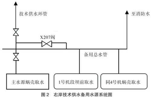 技術(shù)供水系統(tǒng)設(shè)有主、備用水源。主水源是蝸殼取水,作為機(jī)組技術(shù)供水的主用水源。備用水源有兩個(gè),一個(gè)是設(shè)在 1 號(hào)機(jī)段的壩前取水,取水口高程為 145m,另一個(gè)是同 4 號(hào)機(jī)組蝸殼取水共用取水口的蝸殼備用取水。兩路備用水源均接到備用總水管,并通過(guò) X207 閥分別與各臺(tái)機(jī)組的技術(shù)供水系統(tǒng)相連通(見圖 2)。