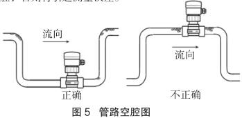 測(cè)量流向取決于二次供水流量計(jì)的安裝方位,將二次供水流量計(jì)在接頭上旋轉(zhuǎn) 180 度即可反向。正流向時(shí),二次供水流量計(jì)的突耳應(yīng)在上游方向。流量顯示總是正的,而累加器可以根據(jù)流向增加或者減少。安裝中確認(rèn)管路設(shè)計(jì)不允許在介質(zhì)中產(chǎn)生氣泡或空腔,否則將引起測(cè)量誤差(見圖 5)。