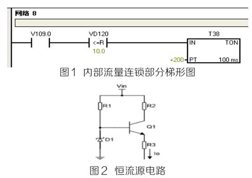 (2)PLC及模塊。PLC及模塊是自動化控制系統(tǒng)主要設(shè)備,且PLC及模塊屬于高集成高精密電子設(shè)備,保持室內(nèi)整潔舒適,可以提高自動化系統(tǒng)運(yùn)行穩(wěn)定性。PLC及模塊硬件運(yùn)行可靠,內(nèi)部控制程序是其控制核心軟件,如PLC硬件出現(xiàn)故障或損壞一般直接更換,但原內(nèi)部控制軟件無法上傳,整個控制系統(tǒng)成失控狀態(tài)。所以其內(nèi)部控制程序在調(diào)試驗(yàn)收合格后應(yīng)及時備份并做好標(biāo)記,為以后修復(fù)PLC故障提供保障。PLC系統(tǒng)的維護(hù)技術(shù)人員需掌握一定基礎(chǔ)PLC控制邏輯原理,對準(zhǔn)確判斷PLC故障點(diǎn)有很大的幫助。例如選礦廠水泵房S7-200系列PLC自動抽水系統(tǒng)出現(xiàn)如下故障 :觸摸屏能控制變頻器啟動水泵抽水,但在短時間內(nèi)會自動停泵,導(dǎo)致無法正常抽水。通過故障現(xiàn)象可初步判斷PLC及模塊硬件設(shè)備正常,主要由于某個變量有問題導(dǎo)致連鎖停機(jī)。打開備份PLC控制梯形圖程序進(jìn)行相關(guān)分析,原來是排污流量計瞬時流量數(shù)值做了連鎖,其在一定時間內(nèi)瞬時流量不大于10m 3 /h時,自動停泵,電磁流量模擬量輸出電流值僅為4ma且無變化,確定排污流量計有故障??膳R時應(yīng)急維修,模擬量模塊輸入模擬電流值10ma~20ma之間一固定數(shù)值即可恢復(fù)正常運(yùn)行。制作簡單恒流源電路代替排污流量計輸出的模擬電流量,實(shí)現(xiàn)解決水泵無法正常運(yùn)行的故障。