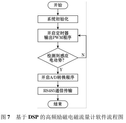 軟件流程圖如圖7 所示。軟件采用模塊化的設(shè)計方法,主要設(shè)計了勵磁控制切換程序、PWM 波產(chǎn)生程序、A/D 轉(zhuǎn)換程序以及 RS485 通信程序等。系統(tǒng)上電后*先執(zhí)行復(fù)位操作,利用 DSP 內(nèi)部的定時器產(chǎn)生PWM 波控制 H 橋電路中的勵磁方式,當(dāng)系統(tǒng)檢測到傳感器線圈輸出的感應(yīng)電動勢后,利用 DSP 內(nèi)部的 12位 A/D 轉(zhuǎn)換器對此信號進行模數(shù)轉(zhuǎn)換,*后根據(jù)相應(yīng)算法計算出管道中被測液體的流量。