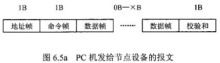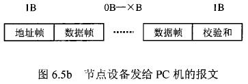 在硫酸流量表等節(jié)點(diǎn)設(shè)備和C機(jī)通信的過(guò)程中,由地址幀、命令幀、數(shù)據(jù)幀、校驗(yàn)和可組成各種功能不同的報(bào)文。由于采用主從工作方式來(lái)實(shí)現(xiàn)通信,硫酸流量表等節(jié)點(diǎn)設(shè)備僅能接收并執(zhí)行PC機(jī)發(fā)送來(lái)的控制命令,而不能發(fā)送命令給PC機(jī)。因此,由PC機(jī)發(fā)往流量計(jì)等節(jié)點(diǎn)設(shè)備的報(bào)文一般包括一個(gè)地址幀,一個(gè)命令幀,若干個(gè)數(shù)據(jù)幀和一個(gè)校驗(yàn)和,其報(bào)文格式圖.6a5所示;而由流量計(jì)等節(jié)點(diǎn)設(shè)備發(fā)往PC機(jī)的報(bào)文一般包括一個(gè)地址幀,若干個(gè)數(shù)據(jù)幀和一個(gè)校驗(yàn)和,其報(bào)文格式如圖6.5b所示。