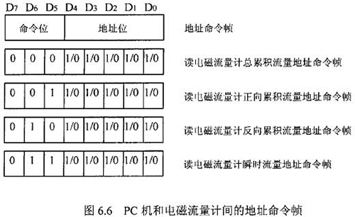 由于RS一485電氣標(biāo)準(zhǔn)規(guī)定每段只能聯(lián)結(jié)犯?jìng)€(gè)節(jié)點(diǎn)設(shè)備,因此可用地址幀中五個(gè)二進(jìn)制位表示這32個(gè)地址,其余3位用來(lái)表示命令,從而構(gòu)成地址命令幀。對(duì)于控制命令需求不超過(guò)八個(gè)的通信系統(tǒng),采用地址命令幀可壓縮報(bào)文長(zhǎng)度提高通信效率。在污水網(wǎng)絡(luò)監(jiān)控系統(tǒng)中,硫酸流量表和PC機(jī)通信的主要目的是將流量計(jì)中的有用數(shù)據(jù)讀到PC機(jī)中。這些數(shù)據(jù)包括:總累積流量、正向累積流量、反向累積流量、瞬時(shí)流量。通信時(shí),PC機(jī)只需向硫酸流量表發(fā)送讀總累積流量、讀正向累積流量、讀反向累積流量、讀瞬時(shí)流量命令即可,因此二者間通信所用的地址幀和命令幀可合二為一,用一個(gè)地址命令幀代替。PC機(jī)和硫酸流量表間的地址命令幀定義如圖.66所示。根據(jù)污水網(wǎng)絡(luò)監(jiān)控系統(tǒng)中PC機(jī)與硫酸流量表間通信的特殊性,二者通信所使用的報(bào)文可簡(jiǎn)化為圖.67的格式。