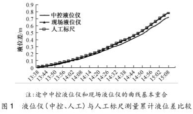 由圖 1 可知,人工標(biāo)尺測得的液位差值與現(xiàn)場液位儀基本吻合,其變化一致,但中控液位儀顯示的數(shù)據(jù)呈現(xiàn)一定的滯后性,這同信號的傳輸距離與解析方式相關(guān)。在日后的測量過程中,對于吸水井和清水池這些對測量結(jié)果影響較大的地方,需進(jìn)行人工標(biāo)尺讀數(shù),或?qū)x表校驗(yàn)后進(jìn)行現(xiàn)場讀數(shù)記錄。