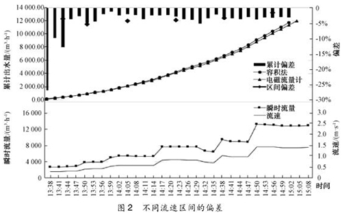 圖 2 的結(jié)果顯示,容積法校驗(yàn)電磁流量計(jì)累計(jì)偏差開始階段不穩(wěn)定,后期趨于穩(wěn)定,在 -3. 0%附近。這是測量中不可避免存在某幾個時刻(特別出廠水流量改變時)某些測量點(diǎn)液位波動較大,導(dǎo)致記錄數(shù)值與真實(shí)情況存有較大差異,一開始累計(jì)出水總量較少,偏差會相對放大,在后期累計(jì)水量大,這一原因?qū)е碌钠顪p少,偏差值也趨于穩(wěn)定。