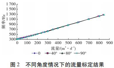 為了考察井眼斜度變化對原水流量計測量流量的影響,開展了非集流原水流量計在不同斜度情況下的流量測量模擬實驗。模擬實驗在大慶油田多相流實驗室進行,儀器外徑 38 mm,模擬井筒內徑為 124 mm,實驗介質是水,傾斜角度分別為 0°、40°、80°和 90°( 水平) ,流量范圍為 5 ~ 850 m3 /d。實驗結果表明,在儀器居中條件下,井眼斜度變化對原水流量計的儀表常數(shù)沒有影響,滿量程誤差不大于 4% ,因此可以應用原水流量計進行水平井注水剖面測量。不同角度情況下的實驗結果如圖 2 所示。