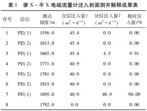 2017 年 9 月在大慶油田采油八廠肇 X - 平 X 水平井注水井中*次進(jìn)行了水平井注入剖面測(cè)井現(xiàn)場(chǎng)試驗(yàn)。該井斜深2 055. 42 m,水平段長度為568. 46 m,試驗(yàn)?zāi)康氖峭ㄟ^注入剖面測(cè)井了解該井各層段的注水情況,同時(shí)對(duì)水平井測(cè)井工藝、儀器的適用性、井下牽引器及井口輔助裝置等設(shè)備的工作有效性和可靠性進(jìn)行評(píng)價(jià)?,F(xiàn)場(chǎng)試驗(yàn)中,在密閉條件下錄取到了該井的注入剖面測(cè)井資料,進(jìn)行了重復(fù)測(cè)量,重復(fù)測(cè)量結(jié)果在誤差允許范圍內(nèi),測(cè)井成果見表 1。該井施工壓力 6. 0 MPa,注入量45. 4 m3 /d,有 7 個(gè)射孔層,分 8 個(gè)測(cè)點(diǎn)測(cè)量,2 個(gè)層有吸入顯示,其中,P13( 1) ( 1 734 ~ 1 767 m) 層絕對(duì)吸入量4. 5 m3 /d,相對(duì)吸入量為9. 91 %,P13( 1) ( 1 899 ~1 943 m)層絕對(duì)吸入量 40. 9 m3 /d,相對(duì)吸入量為 90. 09% ,測(cè)井成果見表 1。通過與甲方的交流,再結(jié)合該井的動(dòng)靜態(tài)資料及周圍井的工作狀況,采油廠的地質(zhì)人員認(rèn)為本次測(cè)井結(jié)果能比較準(zhǔn)確地反映該井的注入情況。