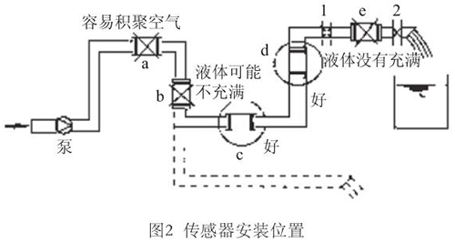 液體流動(dòng)方向必須與傳感器殼體上箭頭方向一致。對(duì)于能正反向測(cè)量的分體式管道電磁流量計(jì),若方向不一致雖仍可測(cè)量,但設(shè)定的顯示流動(dòng)正反方向不符,必須改正之。若拆傳感器工作量大,也可改變傳感器上箭頭方向和重新設(shè)定顯示儀表符號(hào)。管道未充滿液體主要是管網(wǎng)工程設(shè)計(jì)或傳感器安裝位置不妥,使傳感器測(cè)量管內(nèi)不能充滿液體。應(yīng)采取措施,避免安裝如圖2所示a,e位置和以虛線管排放時(shí)b位置,改裝到c,d位置。
