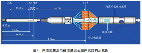 1. 2 內(nèi)流式集流智能高溫水流量計(jì)如圖 4 所示,內(nèi)流式集流電磁組合測(cè)井儀主要采用內(nèi)流式集流智能高溫水流量計(jì),并組合了井溫壓力磁定位儀。利用電磁感應(yīng)原理測(cè)量平均流速,體積流量計(jì)算公為: