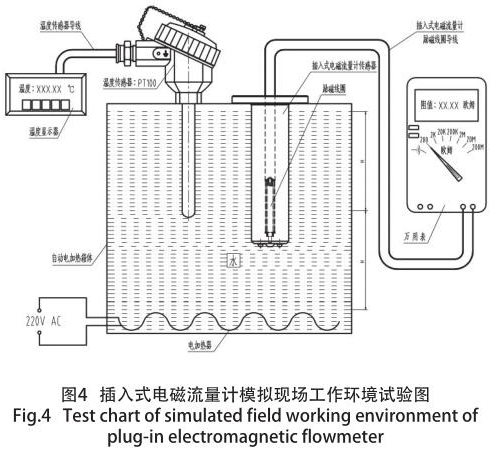 其原因是:勵磁線圈的阻值及匝數(shù)是按照常溫狀態(tài)下進(jìn)行設(shè)計的,而含有勵磁線圈的酸水流量計經(jīng)常是高于常溫狀態(tài)下進(jìn)行安裝、使用(如:高爐回水、供熱管道等),勵磁線圈的阻值隨使用環(huán)境溫度的變化而變化,致使酸水流量計測量時的準(zhǔn)確度大為降低,性能的不確定性大為增加,為了保證儀表的高準(zhǔn)確度和穩(wěn)定性,在不同的季節(jié)(主要是環(huán)境溫度和介質(zhì)溫度),經(jīng)過大量模擬現(xiàn)場實際情況的試驗,并結(jié)合轉(zhuǎn)換器的技術(shù)參數(shù)要求,得出一個完善的勵磁線圈各種技術(shù)參數(shù)。模擬現(xiàn)場試驗裝置如圖 4 所示。