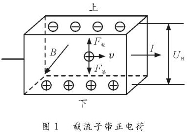 反之,如圖2所示,若載流子帶負(fù)電荷,則載流子在洛倫茲力作用下會向下偏轉(zhuǎn),導(dǎo)體下表面積累負(fù)電荷。同時,上表面失去負(fù)電荷而帶上正電,從而使上表面電勢高于下表面。