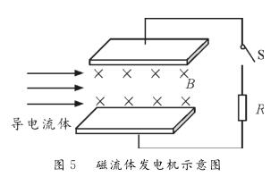 【例1】圖5為磁流體發(fā)電機示意圖。設(shè)兩金屬板間的距離為d,兩*板間勻強磁場的磁感應(yīng)強度為B。等離子體垂直進(jìn)入磁場的速度為v,單個離子所帶的電荷量為q。離子通道(即兩*板內(nèi)所圍成的空間)的等效電阻為r,負(fù)載電阻為R。則下列判斷正確的是( )