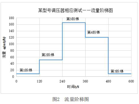 該測試主要利用實驗室測試條件,模擬客戶現(xiàn)場使用情況。其主要測試內(nèi)容包括:測試電磁流量計在+23℃,-30℃和-40℃三種溫度下,電磁流量計出口壓力分別在2.1kPa和30kPa時,流量分別從*1階梯到*5階梯時的響應(yīng)速度,客戶所提供的流量階梯如圖2所示。橫軸表示下游球閥開啟動作時間,縱軸表示循環(huán)水流量計下游需要的流量q。