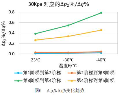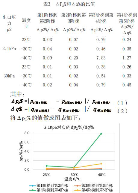 為了更直觀嚴(yán)謹(jǐn)?shù)膶Ρ让總€階段響應(yīng)速度的不同,對原始數(shù)據(jù)進行處理,得到如下表格2和表格3。將△p2%/△q%作為響應(yīng)速度的直觀量化表達,若△p2%/△q%的值大,說明單位流量變化照成的出口壓力變化大,即說明電磁流量計響應(yīng)相對較慢,反之亦然。