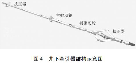 水平井注水井注入剖面測井工藝原理如圖 3 所示。在垂直井段,儀器在重力作用下可以通過注入管柱下入到井內(nèi),注入管柱下端須裝有喇叭口,且喇叭口應(yīng)在造斜點以上,保證測井完成后儀器順利起出,不發(fā)生卡儀器問題。儀器通過喇叭口以后在重力作用下繼續(xù)向下移動,當(dāng)儀器不能靠重力下移時,啟動牽引器,利用牽引器將儀器推送到井底,上提電纜過程中進(jìn)行測井。