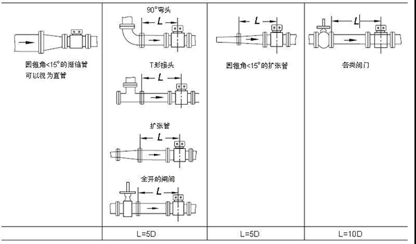 所以在有些流速偏低工況下,為了使原水流量計工作在合適的流速范圍,允許有一定的壓力損失時,可以選擇流量計傳感器的口徑小于管道口徑,在儀表前后增加異徑管,提高介質(zhì)流速。異徑管的中心錐角α不大于15°,可以視為直管,如圖5。
