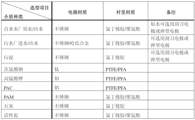 電*對被測量介質(zhì)的耐腐、抗磨蝕、無電化學反應是選擇材質(zhì)考慮的因素。常用金屬材料有含鉬耐酸鋼、哈氏合金B(yǎng)、哈氏合金C、鈦、鉭、鉑銥合金等。由于介質(zhì)種類繁多,其腐蝕性又受溫度、濃度、流速等復雜因素影響而變化,生產(chǎn)廠僅能給出很粗略的各種電*的適用范圍。電*材質(zhì)的選擇可從使用者借鑒該介質(zhì)在其他設備的應用實例和以往的經(jīng)驗來確定。浙江某自來水廠用于計量5-10%次氯酸鈉投加,電*材質(zhì)選擇了哈氏合金,在運行使用1年多的時間后,出現(xiàn)傳感器故障,返廠檢測發(fā)現(xiàn)電*腐蝕,后我司選擇鈦電*材質(zhì),現(xiàn)運行情況良好。水行業(yè)常規(guī)選型詳見表2。