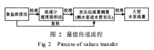 江都泵站曾按ISO標(biāo)準(zhǔn)規(guī)定位置布置26臺(tái)流速計(jì),測(cè)量大型水泵3.5m×1.5m矩形出水流道平均流速,以校準(zhǔn)用差壓法測(cè)量泵進(jìn)水道差壓的流出系數(shù),測(cè)量流速在1.2~1.3m/s之間。期間還用食鹽濃度法校準(zhǔn)流速計(jì)面積法,在實(shí)驗(yàn)過(guò)程中再用食鹽濃度法復(fù)核流速計(jì)面積法的數(shù)據(jù)。量值傳遞流程如圖2所示。