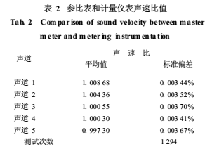再?gòu)挠?jì)量?jī)x表與參比表五個(gè)聲道的各聲道間,求取聲速比值考察儀表的穩(wěn)定性,表2摘錄流量在5500m³/h時(shí)的聲速比,五個(gè)聲道兩儀表聲速比變化*大為0.006%。