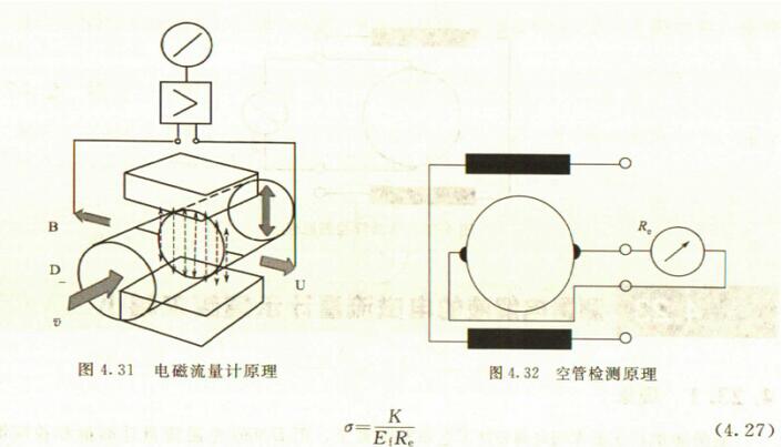 分體電磁流量計是專為測量導(dǎo)電液體的體積流量而設(shè)計的。測量原理是基于法拉*電磁感應(yīng)定律。按照該定律,導(dǎo)電流體通過磁場作切割磁力線運動時,在垂直于磁場及流速的方向上產(chǎn)生感應(yīng)電動勢,此電動勢由4.14節(jié)中的式4.24)給出。其原理如圖4.31所示。