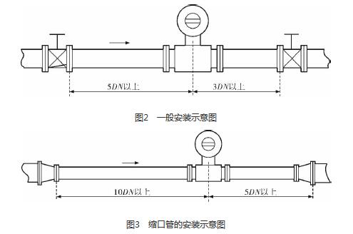 dn200污水流量計的安裝質(zhì)量對其測量結(jié)果的影響較大,因此在安裝時需要注意幾個問題。*先,dn200污水流量計直管段的選擇在配管時一定要按照要求進行選擇,一般選擇流量計通徑與工藝管道通徑相同,即可滿足工程需要,而且安裝方便、壓力損失小,流量計直管段上游側(cè)的長度不少于5倍工藝管道直徑,下游側(cè)的長度不少于3倍工藝管道直徑(圖2)。但在流速太慢而又要求精度較高或需要變徑的應用場合,可選擇通徑小于工藝管道通徑的流量計,以提高測量精度,此時流量計上、下游必須加裝異徑管,且進口異徑管上游側(cè)應有長于10倍工藝管道直徑的直管段,下游側(cè)應有長于5倍工藝管道直徑的直管段(圖3)。