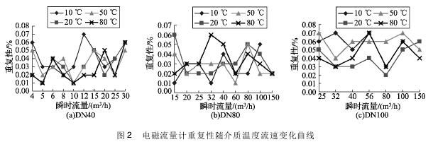 將實(shí)驗(yàn)測(cè)得的粘土漿流量計(jì)在不同溫度及流速下的重復(fù)性數(shù)據(jù)整理,特性曲線如圖2所示,3組曲線分別對(duì)應(yīng)DN40、DN80、DN100的3塊粘土漿流量計(jì)的重復(fù)性曲線。