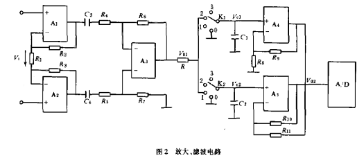 從圖2中可以看出,由Al,A2,A3。所組成的放大電路為一個典型的高輸入阻抗的雙端輸入、單端輸出的交流放大電路。由A4,A5所組成的放大電路為一個高輸入阻抗的雙端輸入、單端輸出的直流放大電路。K1,K2采用模擬開關(guān)CD4052。這是一個雙路四通道的模擬開關(guān)。電路中的兩個開關(guān)是同步的。R是濾波電阻,C1,C2是兩只容量相同的濾波電容。