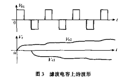 應(yīng)該指出的是RC濾波對方波信號也起延緩作用,但經(jīng)過七個周期的方波之后,電容上的電壓與方波的實際峰值誤差只有0.02%。電容上的波形與V01的波形如圖3所示。