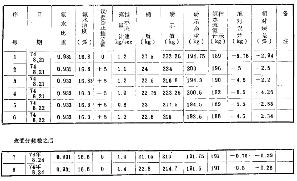 測試方法:將氨水通過流量計計量后,放入氨水桶,用磅秤稱其重量,以磅秤示數(shù)為標(biāo)準(zhǔn),求氨水流量計之誤差。現(xiàn)將幾次典型實測數(shù)據(jù)列表于后: